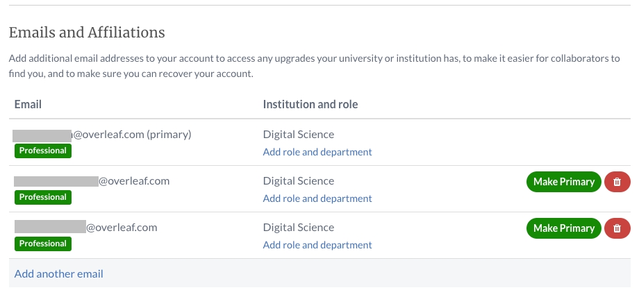 Adding secondary email addresses to your Overleaf account prevents you from accidentally creating additional Overleaf accounts using those emails.
