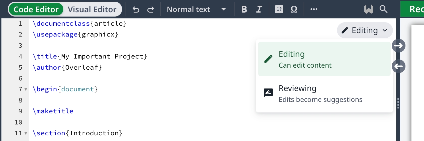 Track Changes can be accessed by switching to reviewing mode. To switch modes, click the icon at the top right of the Overleaf editor and choose from the options that appear.