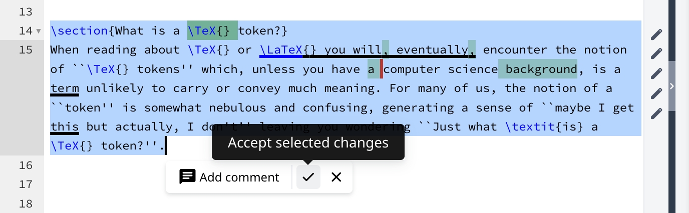 - After the text is selected, the option to Accept selected changes or Reject selected changes will appear, as shown in the following example:
