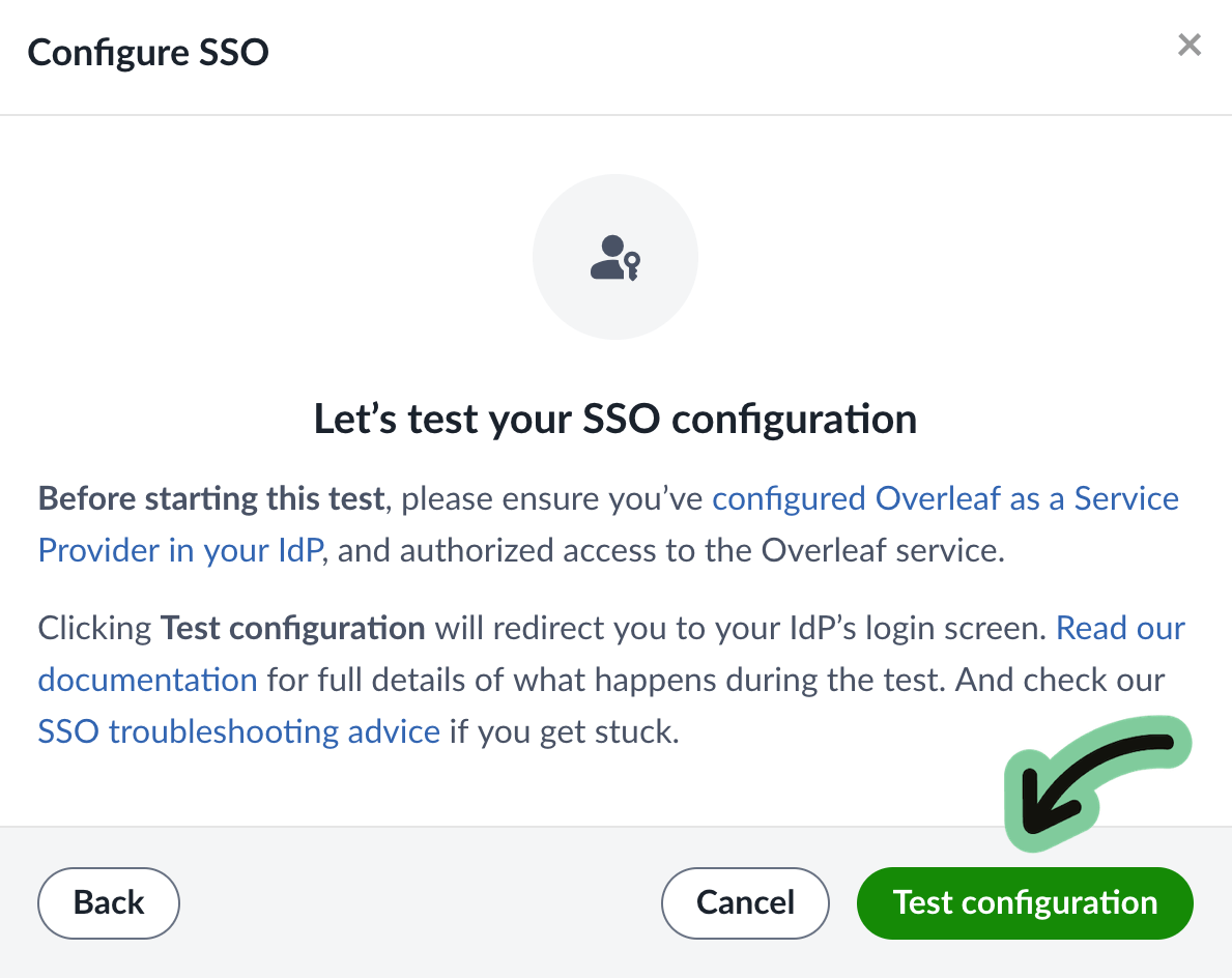 If you're having trouble, please review the test troubleshooting guide. Fixing problems may require adjusting the configuration in your IdP and in Overleaf. If you are unable to complete the test, please get in touch.