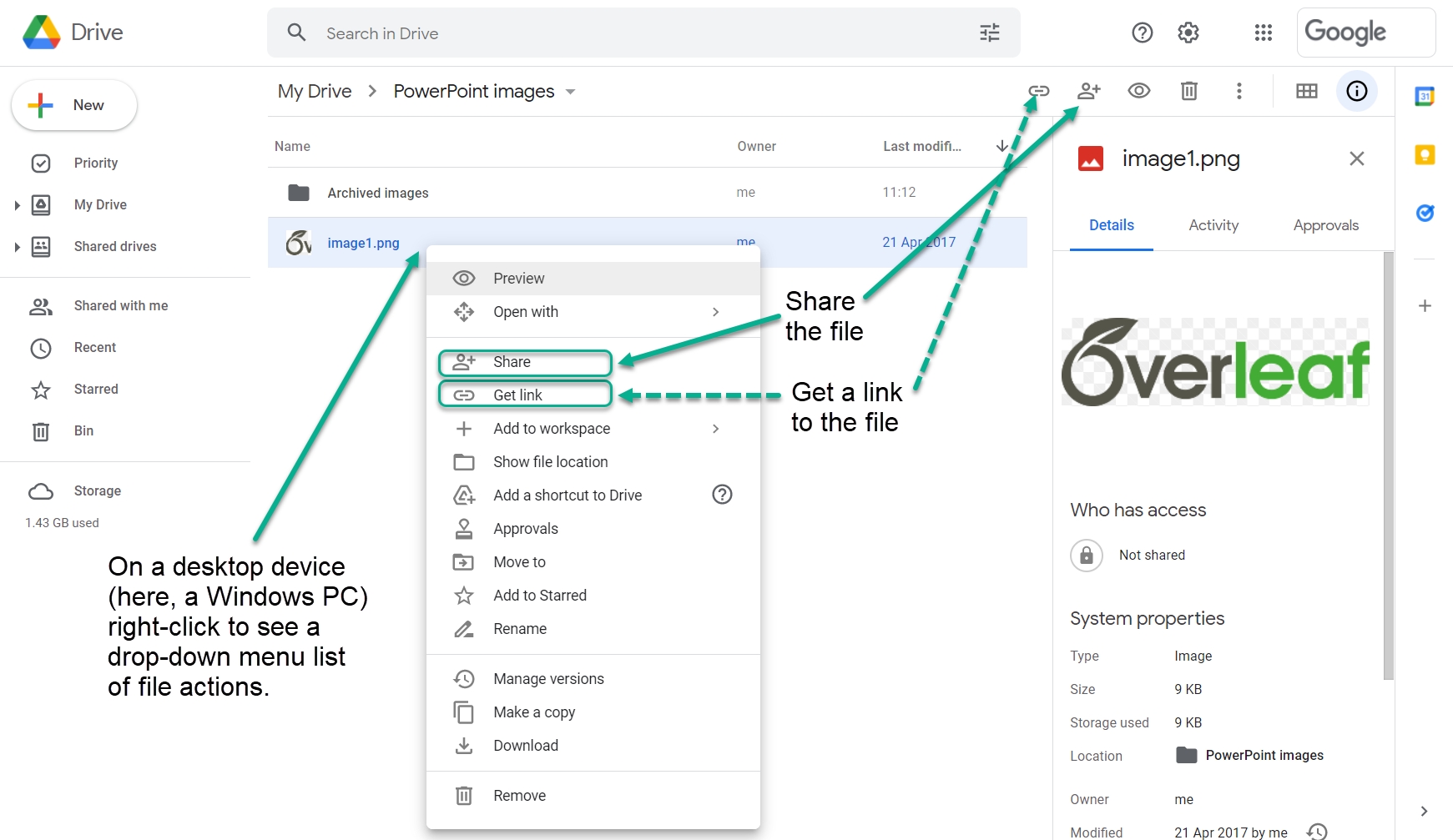 Next, you need to share that file, to make it accessible outside of Google Drive. The following screenshot, taken on a desktop PC, shows how to access the file-sharing and file-link options within Google Drive: