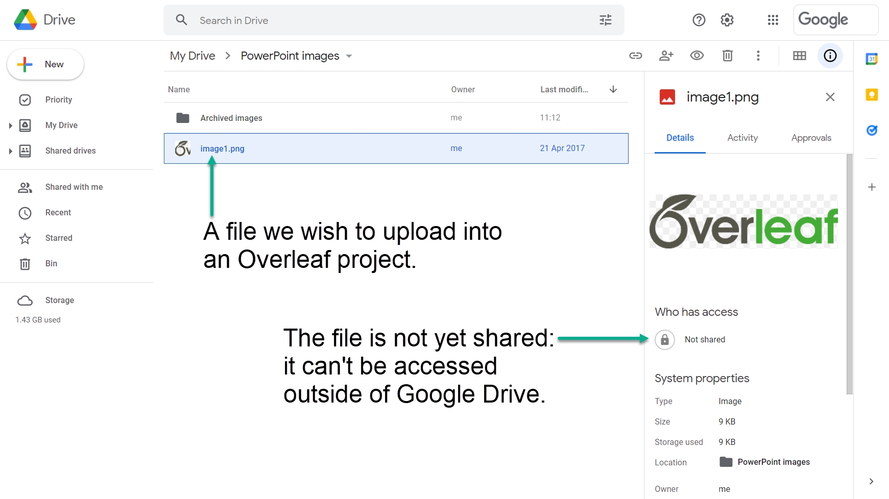 Start by identifying a file stored in Google Drive that you want to upload into your Overleaf project: