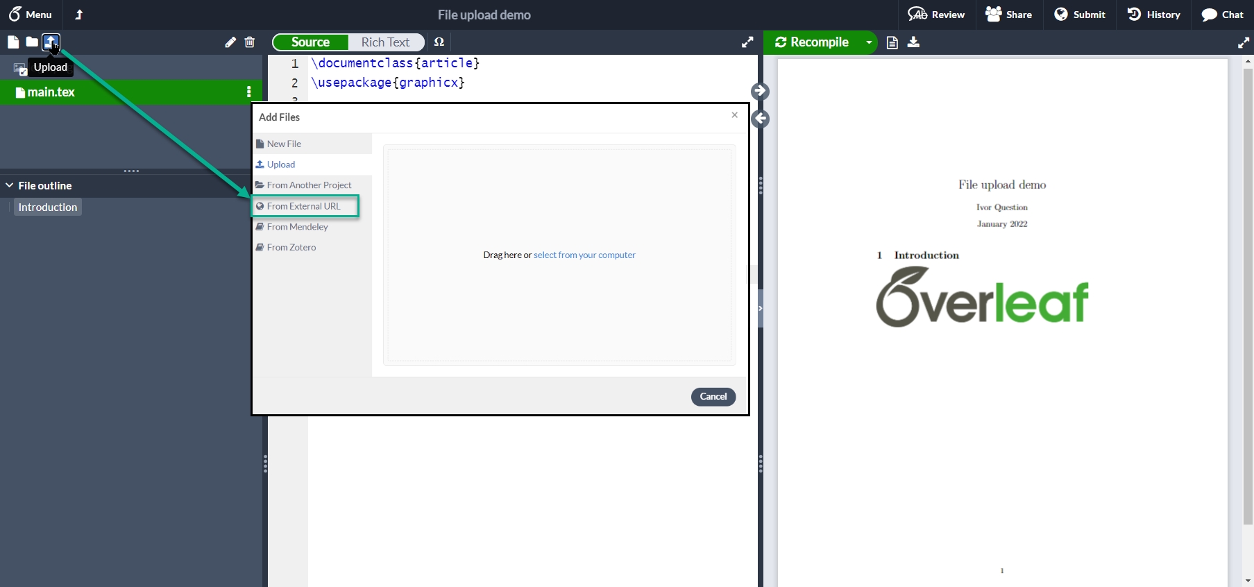 To use the download URL, select Overleaf’s file upload feature and choose From External URL: