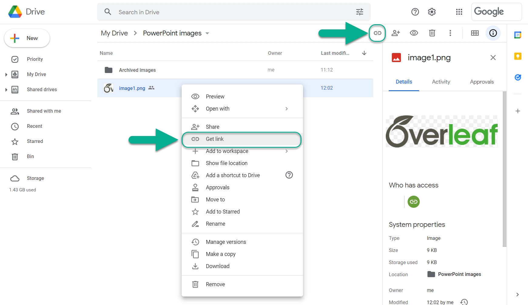 After copying the Google Drive link (URL), paste it into a text editor of your choice—because we will use it to derive a direct download URL for use with Overleaf: a URL that Overleaf can use to download the Google Drive file and add it to your project.