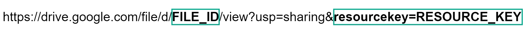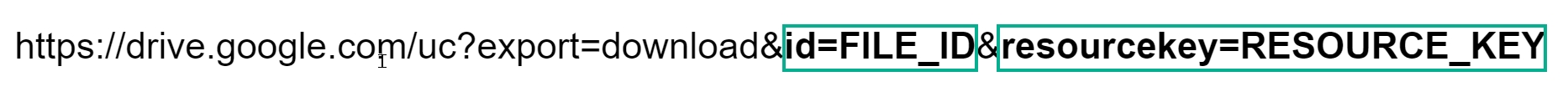 https://drive.google.com/uc?export=download&id=FILE_ID&resourcekey=RESOURCE_KEYHere is an image highlighting use of the FILE_ID and RESOURCE_KEY components within the constructed download URL: