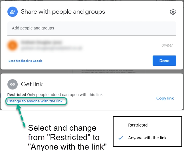 Here, we’ll share the file with anyone who has the Google Drive link by changing the link-sharing setting from Restricted to Anyone with the link, as shown in the following screenshot taken from a desktop device (Windows laptop):