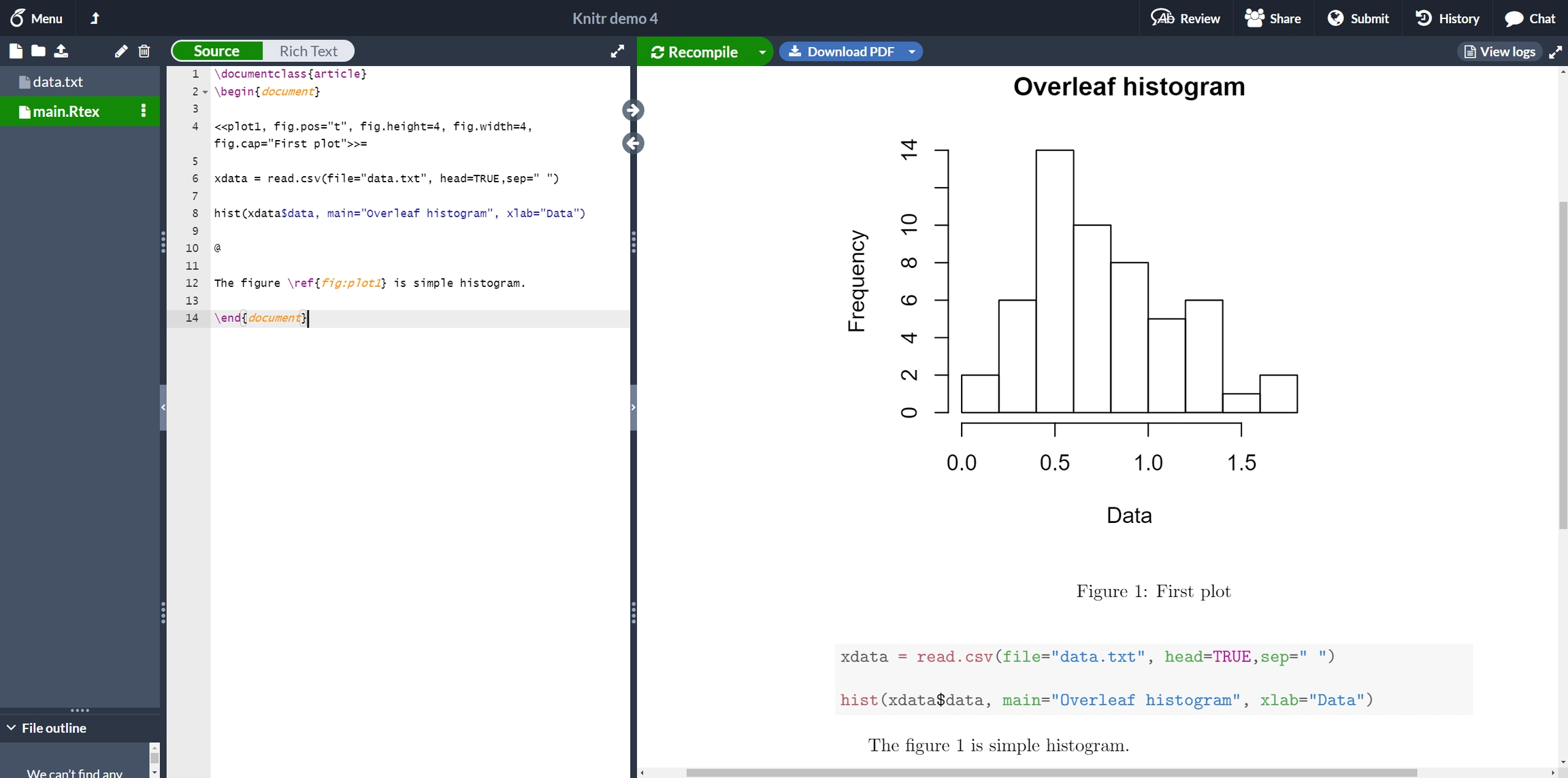 This histogram uses data stored in "data.txt", saved in the current working directory. A few figure-related options are passed to the chunk.