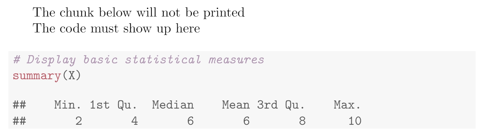 A code block like the one presented in the previous section is usually called a chunk. You can set some extra options in knitr chunks. See the example below: