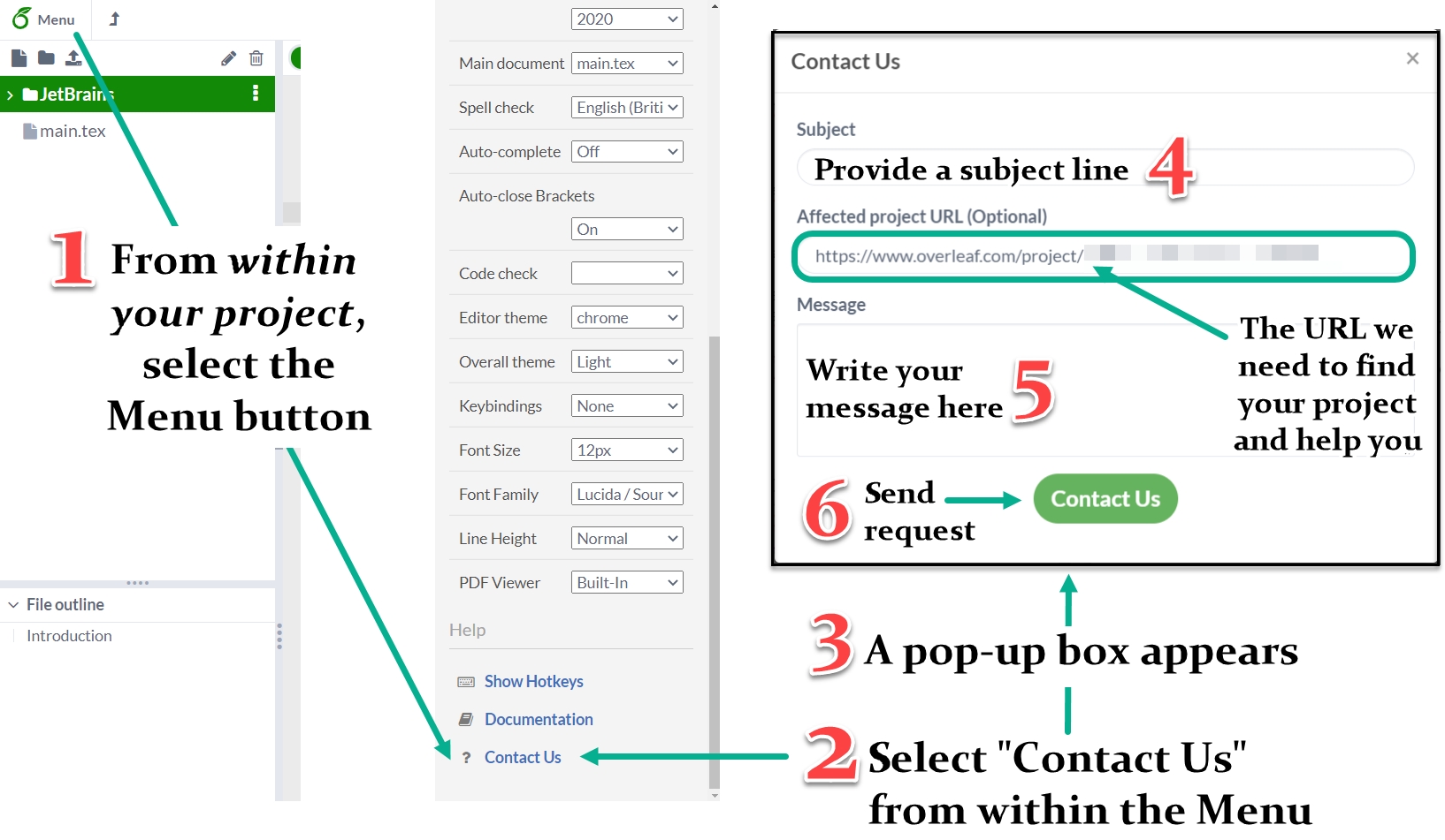 If, after trying the above, you do run into an error on Overleaf that you can’t solve, our support team may be able to help! The best way to contact us is via the Contact Us link at the bottom of the project menu of the project you’re having trouble with: